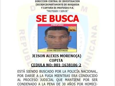 La Policía Nacional, a través de la Dirección Central de Investigación (Dicrim), informó que mantiene activa la búsqueda de Jeison Alexis Moreno, alias “Copita”, de 42 años, quien se fugó mientras era conducido a cumplir el proceso judicial correspondiente, tras ser condenado a 30 años de prisión por homicidio agravado.Según una nota de prensa, Moreno fue condenado por haber quitado la vida, el 24 de noviembre del 2020, a tres ciudadanos dominicanos, entre ellos una pareja de esposos identificados como Virgen Ramírez (38) y Tony Encarnación, cuyos cuerpos fueron encontrados sobre el pavimento frente a su residencia en el distrito municipal de Los Jovillos, provincia de Azua. El prófugo había sido apresado en el año 2024 por miembros del Dicrim, cuando intentaba salir del país por el Aeropuerto Internacional de las Américas, en cumplimiento de tres órdenes judiciales en su contra. RELACIONADAS América Latina La Procuraduría colombiana pide revocar la condena contra el expresidente Álvaro Uribe América Latina Las claves de la condena del expresidente colombiano, Álvaro Uribe América Latina Expresidente colombiano Álvaro Uribe fue hallado culpable por soborno a un paramilitar La institución del orden advirtió que Moreno es considerado sumamente peligroso. Solicita colaboración Además,instó a la ciudadanía a colaborar con las autoridades aportando cualquier información que permita dar con su paradero y captura, garantizando la confidencialidad de las denuncias.