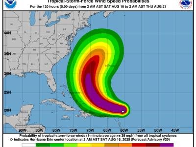El huracán Erin continúa intensificándose rápidamente y ya ha alcanzado la categoría 4 en la escala Saffir-Simpson, según el más reciente informe intermedio del Centro Nacional de Huracanes (CNH) emitido este sábado por la mañana. Las bandas de lluvia externas ya comienzan a afectar partes de las Islas de Sotavento del norte.A las 8:00 a.m. hora del Atlántico (1200 UTC), el centro de Erin se localizaba cerca de la latitud 19.6 norte y longitud 62.0 oeste, aproximadamente a 120 millas (195 kilómetros) al noreste de Anguilla. El sistema se desplaza hacia el oeste-noroeste a una velocidad de 20 mph (31 km/h), y se espera que mantenga esta trayectoria hasta el final del fin de semana, con una posible disminución gradual en su velocidad de avance. Un giro hacia el norte se anticipa a comienzos de la próxima semana.Vientos y presión: una amenaza en aumentoLos vientos máximos sostenidos han aumentado a 145 mph (230 km/h), con ráfagas más altas, consolidando a Erin como un poderoso huracán de categoría 4. La presión central mínima estimada es de 935 milibares (27.61 pulgadas), según datos obtenidos por aviones Cazahuracanes de la NOAA y la Reserva de la Fuerza Aérea.Los vientos con fuerza de huracán se extienden hasta 30 millas (45 km) del centro, mientras que los vientos con fuerza de tormenta tropical alcanzan hasta 125 millas (205 km), principalmente al norte del sistema.Vigilancias y advertenciasActualmente, hay una vigilancia de tormenta tropical en efecto para: St. Martin y St. Barthelemy Sint Maarten Esto significa que condiciones de tormenta tropical son posibles en las próximas 12 horas en estas áreas. Aunque no se han emitido nuevas advertencias en esta actualización, se insta a los residentes de las Islas de Sotavento del norte, las Islas Vírgenes, Puerto Rico, así como las Turcas y Caicos y las Bahamas del sureste, a seguir de cerca la evolución del huracán.Lluvias y viento: impactos previstosSe prevé que las bandas exteriores de Erin produzcan lluvias intensas entre hoy y mañana en las Islas de Sotavento del norte, las Islas Vírgenes y Puerto Rico, con acumulaciones de 2 a 4 pulgadas y máximos aislados de hasta 6 pulgadas. Estas precipitaciones podrían generar inundaciones urbanas y repentinas localmente significativas, así como deslizamientos de tierra en áreas montañosas.Oleaje peligro afectará República DominicanaAdemás, se esperan condiciones de tormenta tropical dentro del área bajo vigilancia más tarde hoy. El oleaje generado por Erin afectará varias zonas del Caribe, incluyendo las Islas de Sotavento del norte, las Islas Vírgenes, Puerto Rico, La Española, y las Islas Turcas y Caicos durante el fin de semana. Estas condiciones se extenderán hacia las Bahamas, Bermudas y la costa este de Estados Unidos a principios de la próxima semana, generando un oleaje peligroso y corrientes marinas potencialmente mortales.El CNH recomienda a la población seguir las actualizaciones oficiales y consultar a sus servicios meteorológicos locales para obtener información específica para sus regiones.